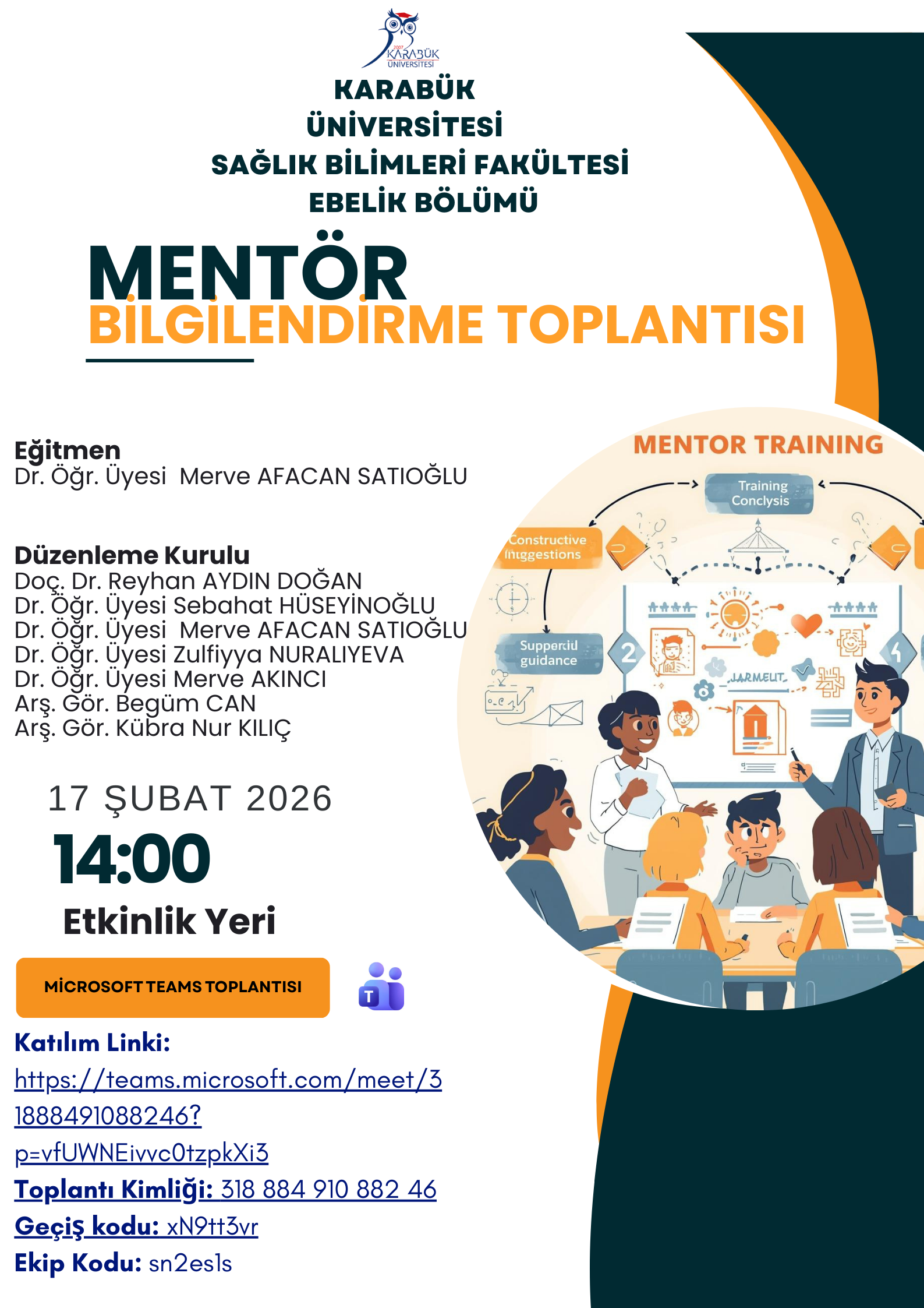 Karabük Üniversitesi Sağlık Bilimleri Fakültesi Ebelik Bölümü tarafından, mentörlere yönelik “Mentör Bilgilendirme Toplantısı” düzenlenecektir.