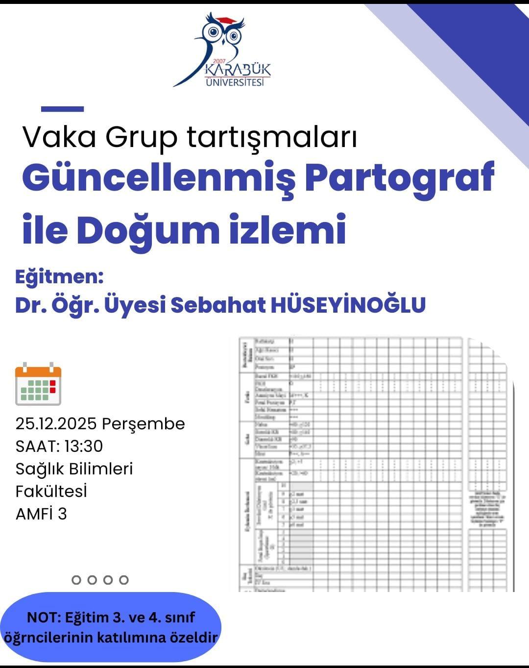 Karabük Üniversitesi Sağlık Bilimleri Fakültesi Ebelik Bölümü tarafından, 25 Aralık 2025 Perşembe günü, “Güncellenmiş Partograf ile Doğum İzlemi” başlıklı vaka grup tartışması etkinliği gerçekleştirilmiştir.
