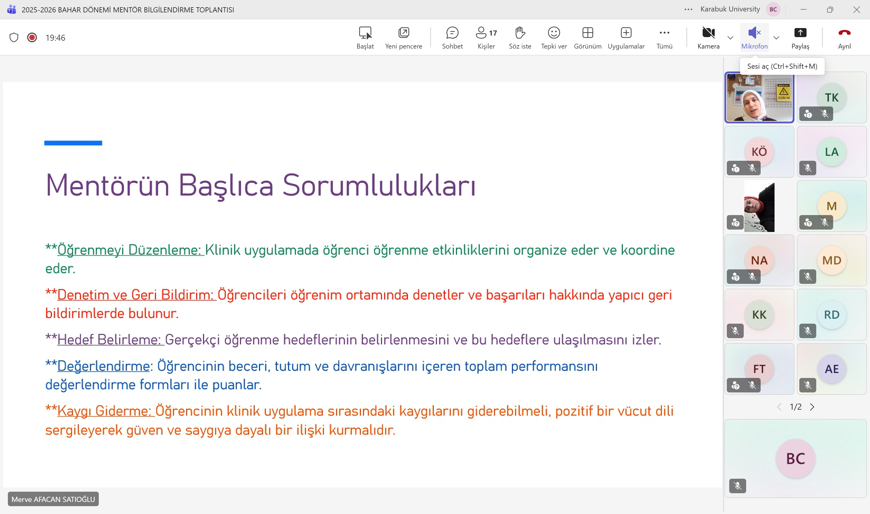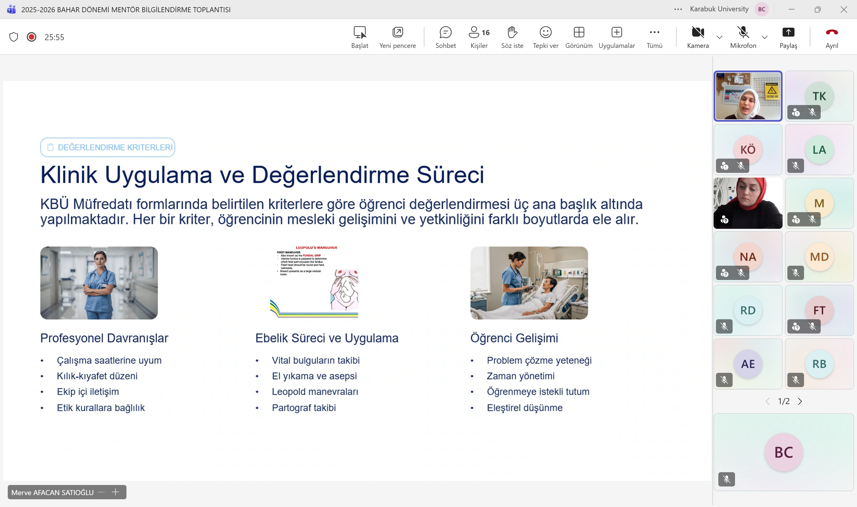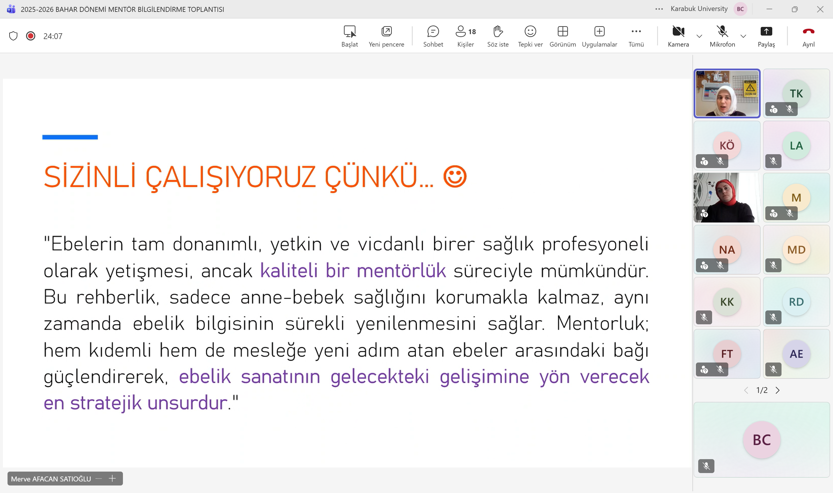 Karabük Üniversitesi Sağlık Bilimleri Fakültesi Ebelik Bölümü tarafından mentörlere yönelik planlanan “Mentör Bilgilendirme Toplantısı”, 17 Şubat 2026 tarihinde saat 14.00’te çevrim içi olarak Microsoft Teams üzerinden başarıyla gerçekleştirildi.