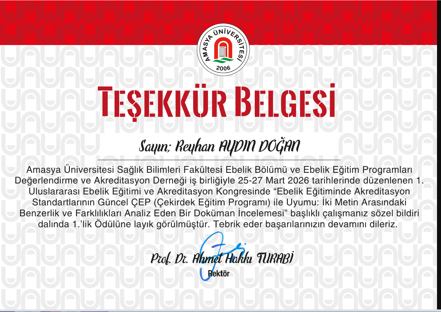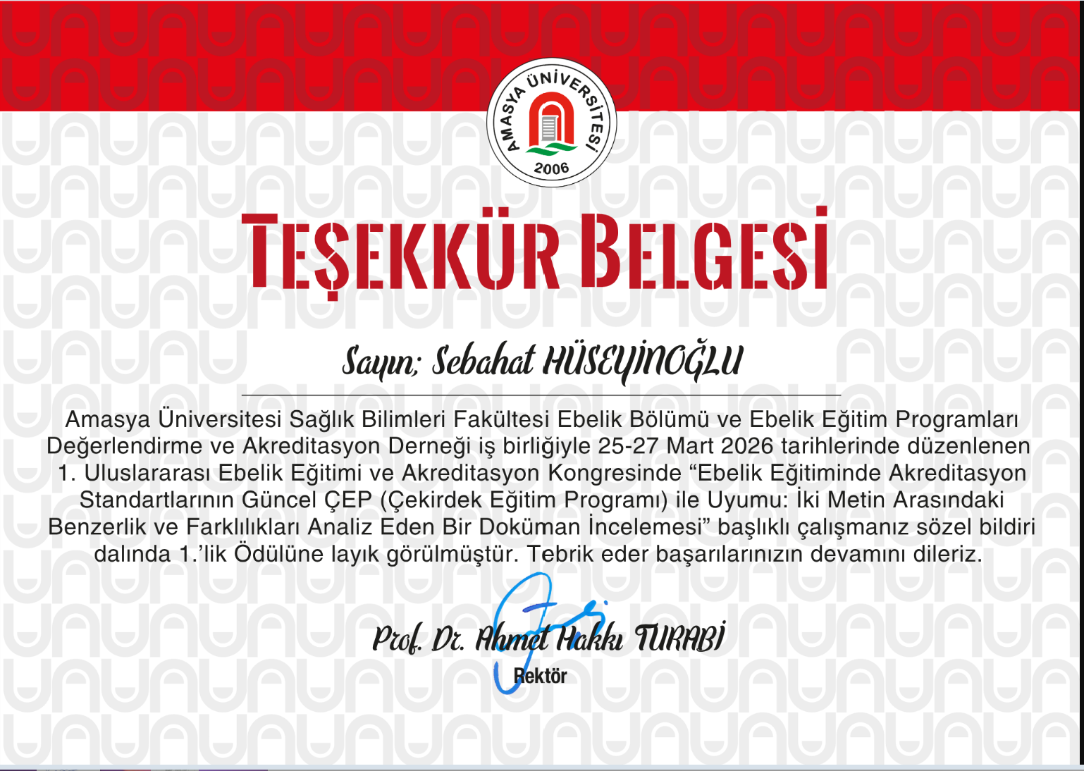 Amasya Üniversitesi Sağlık Bilimleri Fakültesi Ebelik Bölümü ile Ebelik Eğitim Programları Değerlendirme ve Akreditasyon Derneği iş birliğinde 25-27 Mart 2026 tarihleri arasında düzenlenen 1. Uluslararası Ebelik Eğitimi ve Akreditasyon Kongresi’nde bölümümüz önemli bir başarıya imza atmıştır.