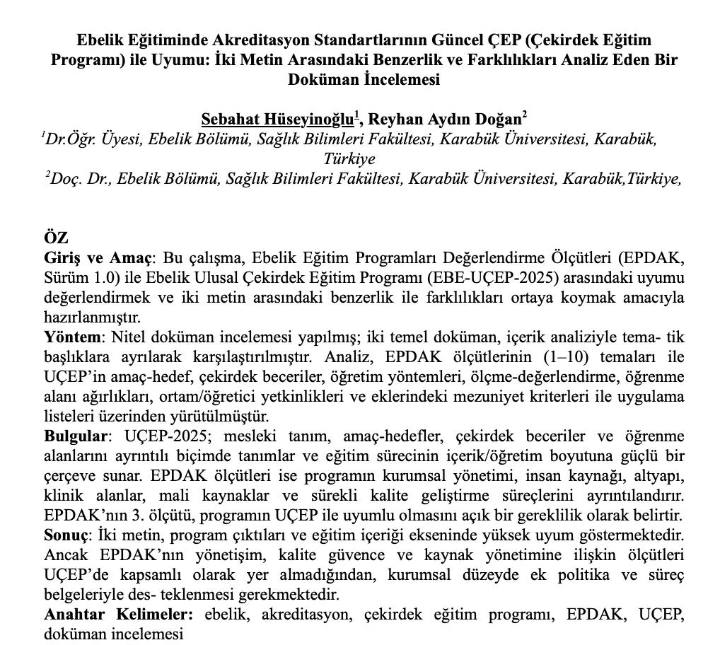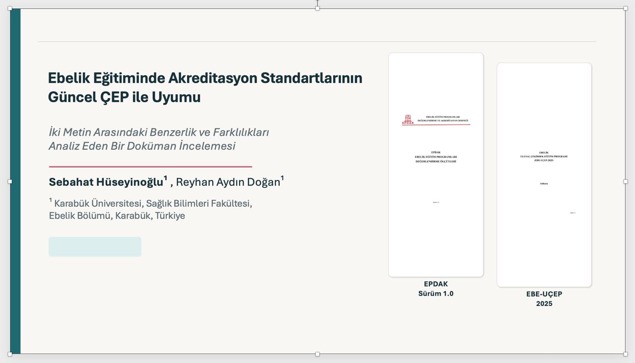 Bölüm Başkanımız Doç. Dr. Reyhan Aydın Doğan ve Bölüm Başkan Yardımcımız Dr. Öğr. Üyesi Sebahat Hüseyinoğlu, “Ebelik Eğitiminde Akreditasyon Standartlarının Güncel ÇEP (Çekirdek Eğitim Programı) ile Uyumu: İki Metin Arasındaki Benzerlik ve Farklılıkları Analiz Eden Bir Doküman İncelemesi” başlıklı çalışmalarıyla Sözel Bildiri Alanında Birincilik Ödülü almaya layık görülmüştür.