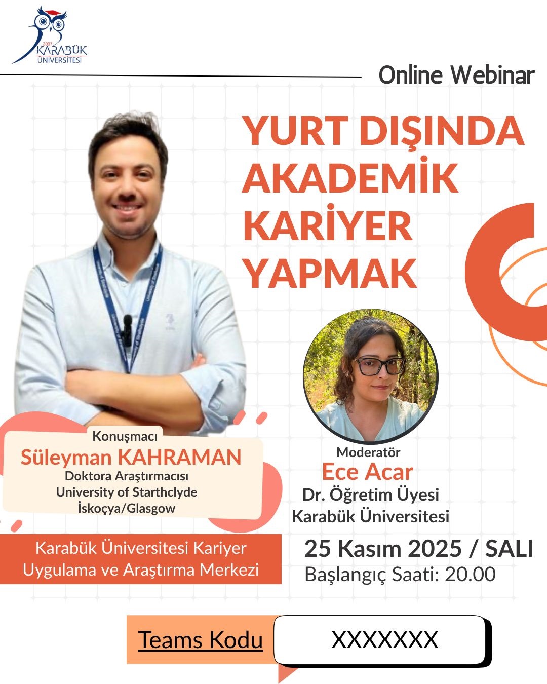 İskoçya, University of Starthclyde Doktora araştırmacısı, bölümümüz 2016 yılı mezunu Süleyman KAHRAMAN "Yurtdışında Akademik Kariyer Yapmak" konulu webinar gerçekleştirdi, bilgi ve deneyimlerini öğrencilerimizle paylaştı.