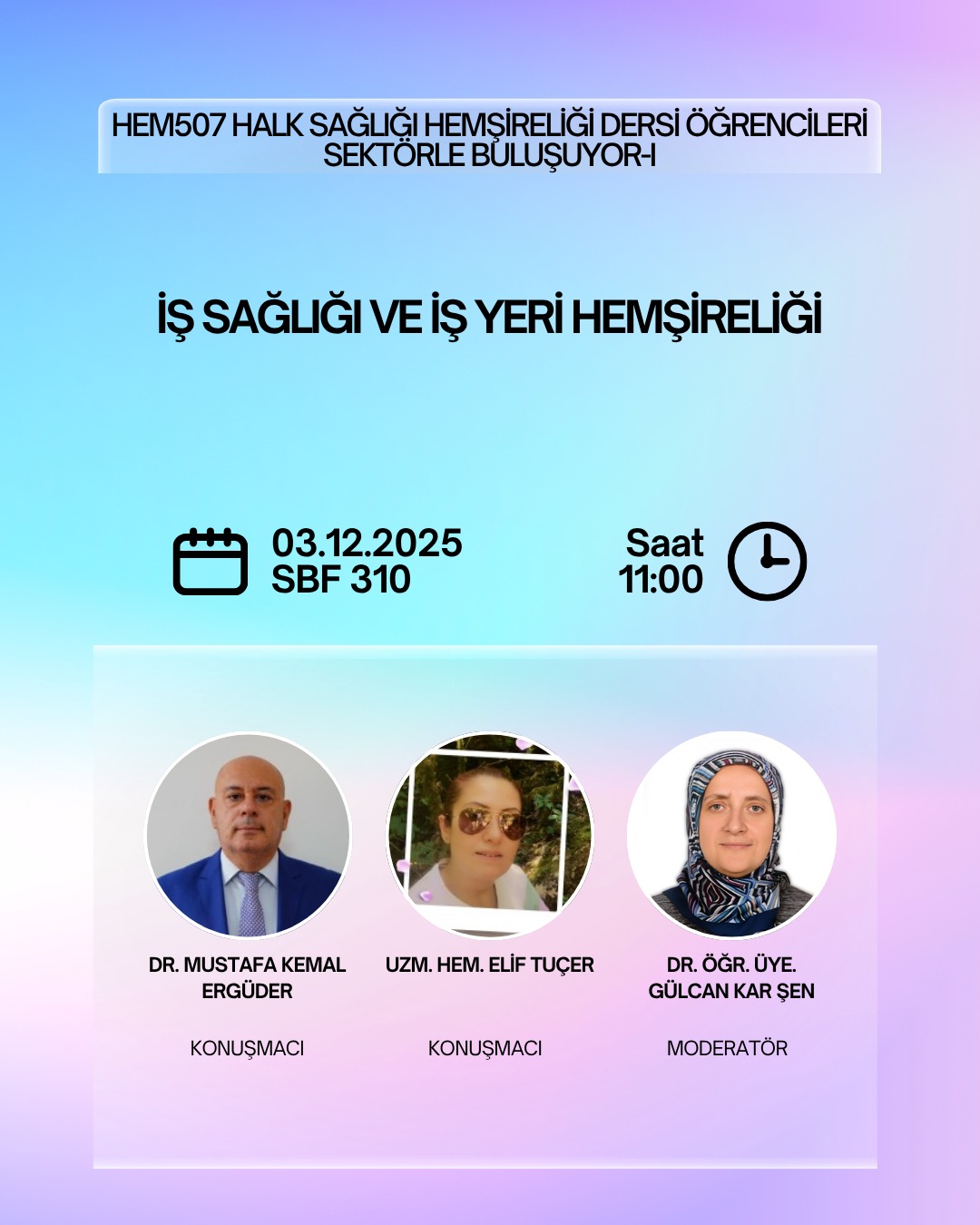 HEM507 Halk Sağlığı Hemşireliği Dersi Öğrencileri Sektörle Buluşuyor-I etkinliği kapsamında “İş Sağlığı ve İş Yeri Hemşireliği” konulu konferans 3 Aralık 2025 tarihinde saat 11.00’de SBF 310 numaralı derslikte gerçekleştirilecektir.