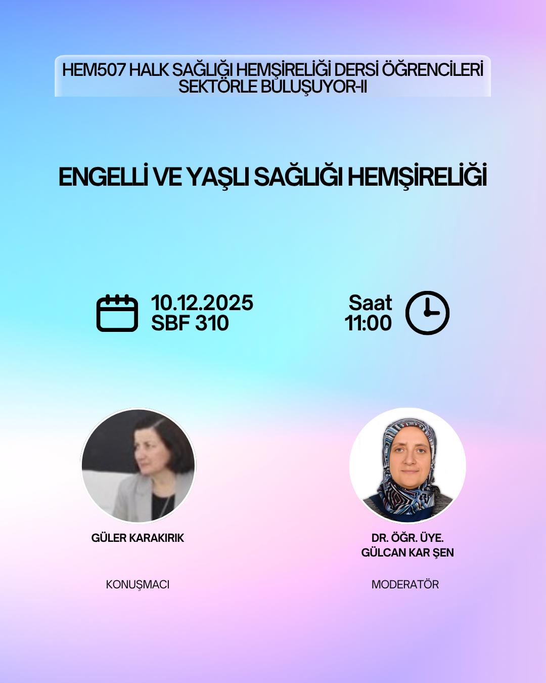 HEM507 Halk Sağlığı Hemşireliği Dersi Öğrencileri Sektörle Buluşuyor-II etkinliği kapsamında “Engelli ve Yaşlı Sağlığı Hemşireliği” konulu konferans, 10 Aralık 2025 tarihinde saat 11.00’de SBF 310 numaralı derslikte gerçekleştirilecektir.