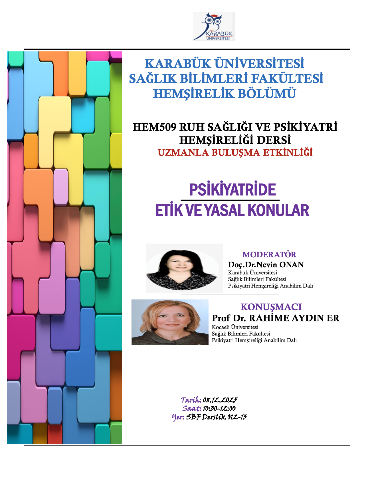 Fakültemiz Hemşirelik Bölümü HEM509 Ruh Sağlığı ve Psikiyatri Hemşireliği dersi kapsamında “Psikiyatride Etik ve Yasal Konular” konulu bir uzmanla buluşma etkinliği gerçekleştirilecektir.