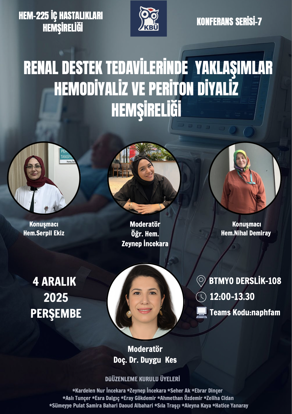 Hem 225 İç Hastalıkları Hemşireliği Konferans Serisi–7 kapsamında, “Renal Destek Tedavilerinde Yaklaşımlar: Hemodiyaliz ve Periton Diyaliz Hemşireliği” başlıklı konferans 4 Aralık 2025 Perşembe günü saat 12.00–13.30 arasında gerçekleştirilecektir.