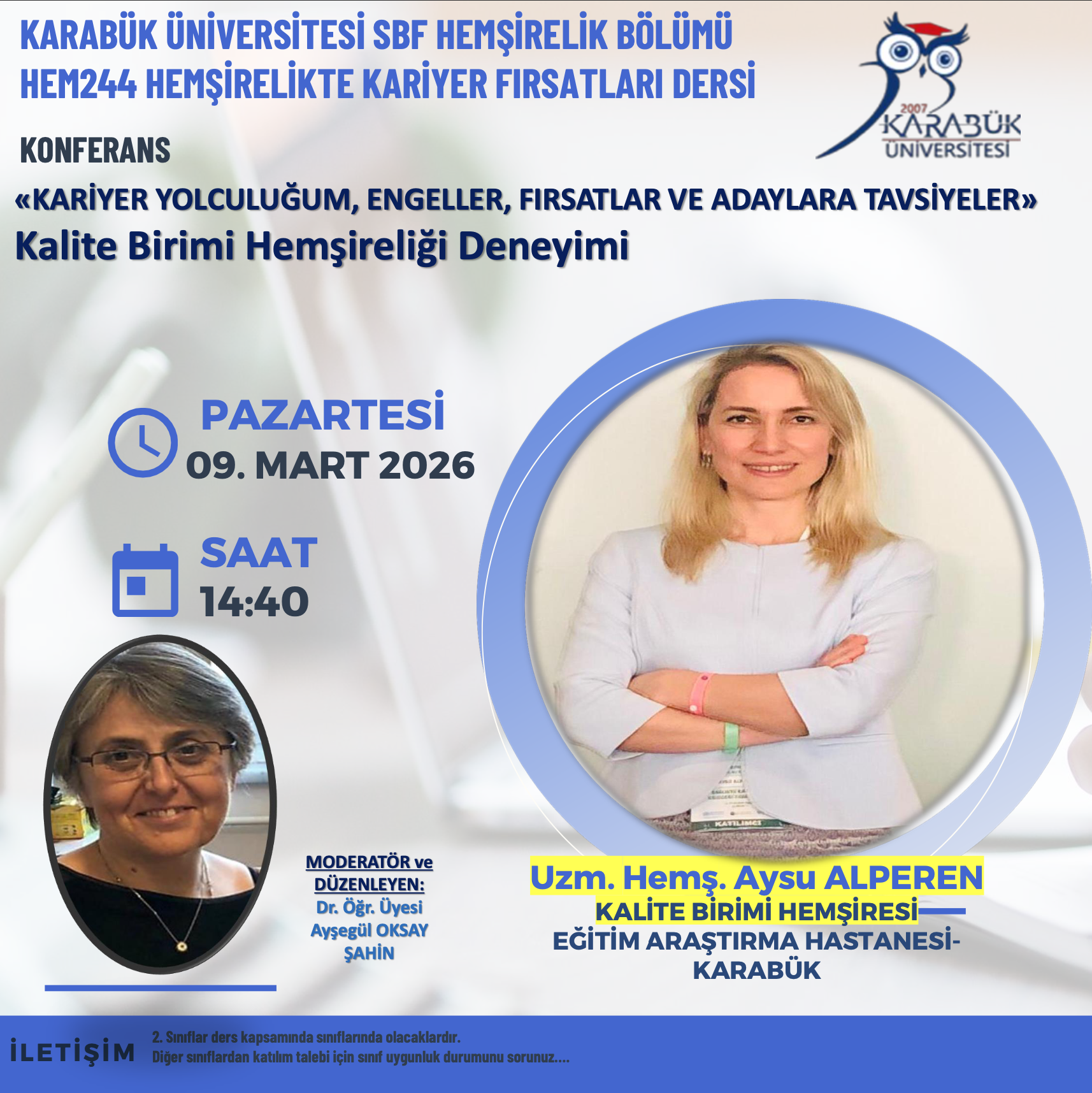 Lisansüstü eğitimini üniversitemizde tamamlayan Mezunumuz Uzm. Hemş. Aysu ALPEREN Kalite Birimi Hemşireliği ve mesleki deneyimlerini paylaşmak üzere HEM244 Hemşirelikte Kariyer Fırsatları dersi kapsamında 2. sınıf öğrencileri ile olacak. Diğer sınıflardan katılım talebi için lütfen sınıf uygunluk durumunu sorunuz.