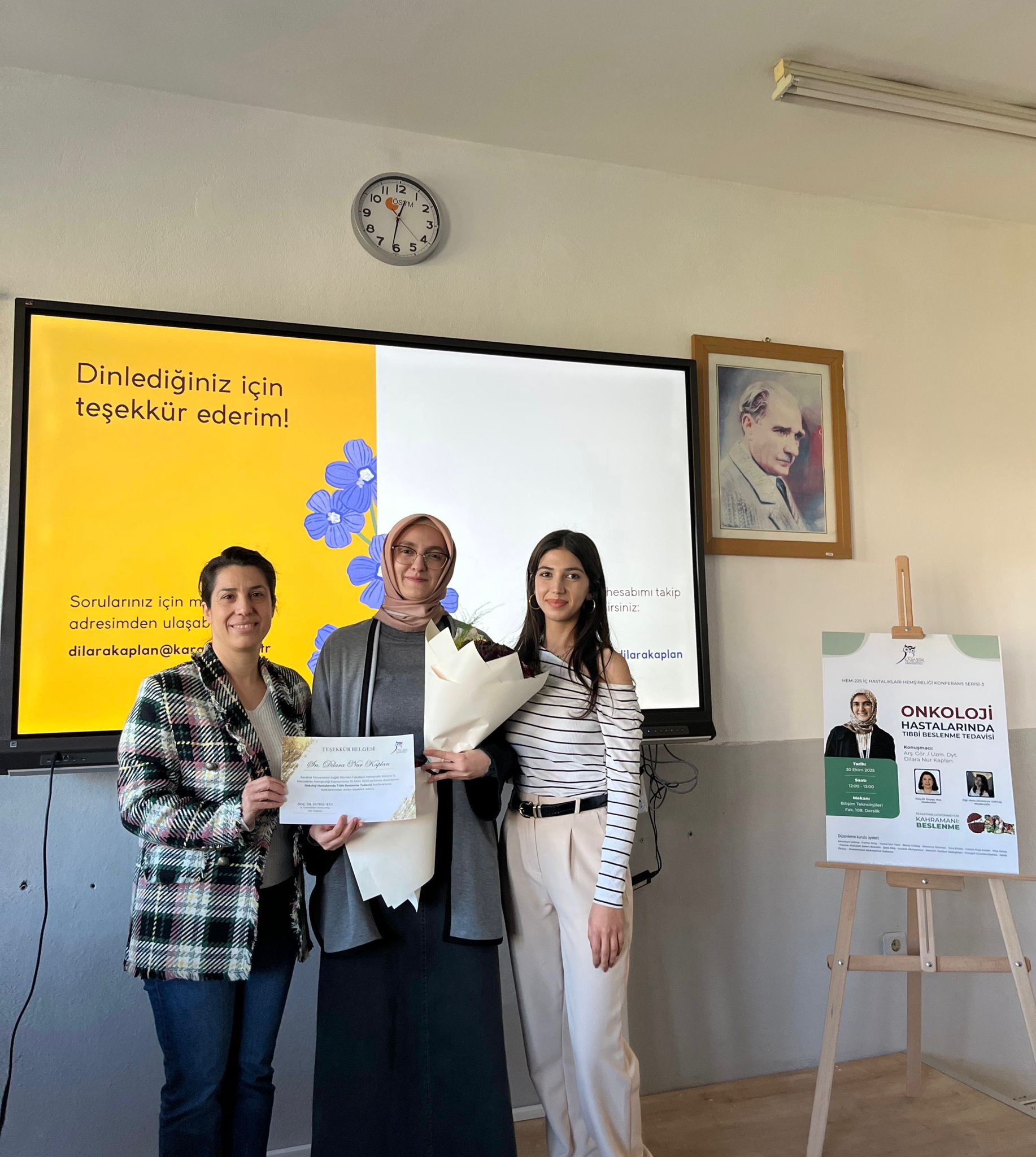 Konferansta Uzm. Dyt. Dilara Nur Kaplan, kanser hastalığına dair temel bilgilere ve kanser tedavisinde beslenmenin rolüne değinerek; hastalarda enerji, protein, sıvı, vitamin-mineral gereksinimleri, nötropenik diyet uygulamaları ve vaka örnekleri üzerinden tıbbi beslenme tedavisinin temel yaklaşımlarını aktardı.