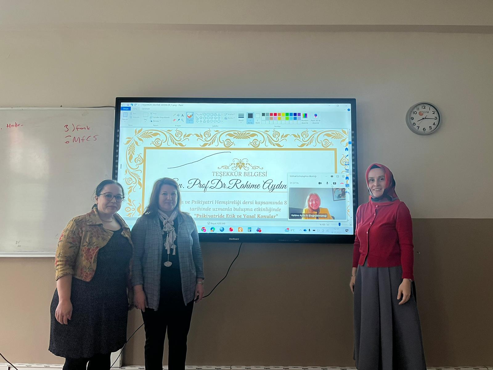 Moderated by Assoc. Prof. Dr. Nevin Onan, the event featured Prof. Dr. Rahime Aydın Er, faculty member of the Department of Psychiatric Nursing at Kocaeli University Faculty of Health Sciences, who participated online and shared her knowledge and experience on “Ethical and Legal Issues in Psychiatry.”