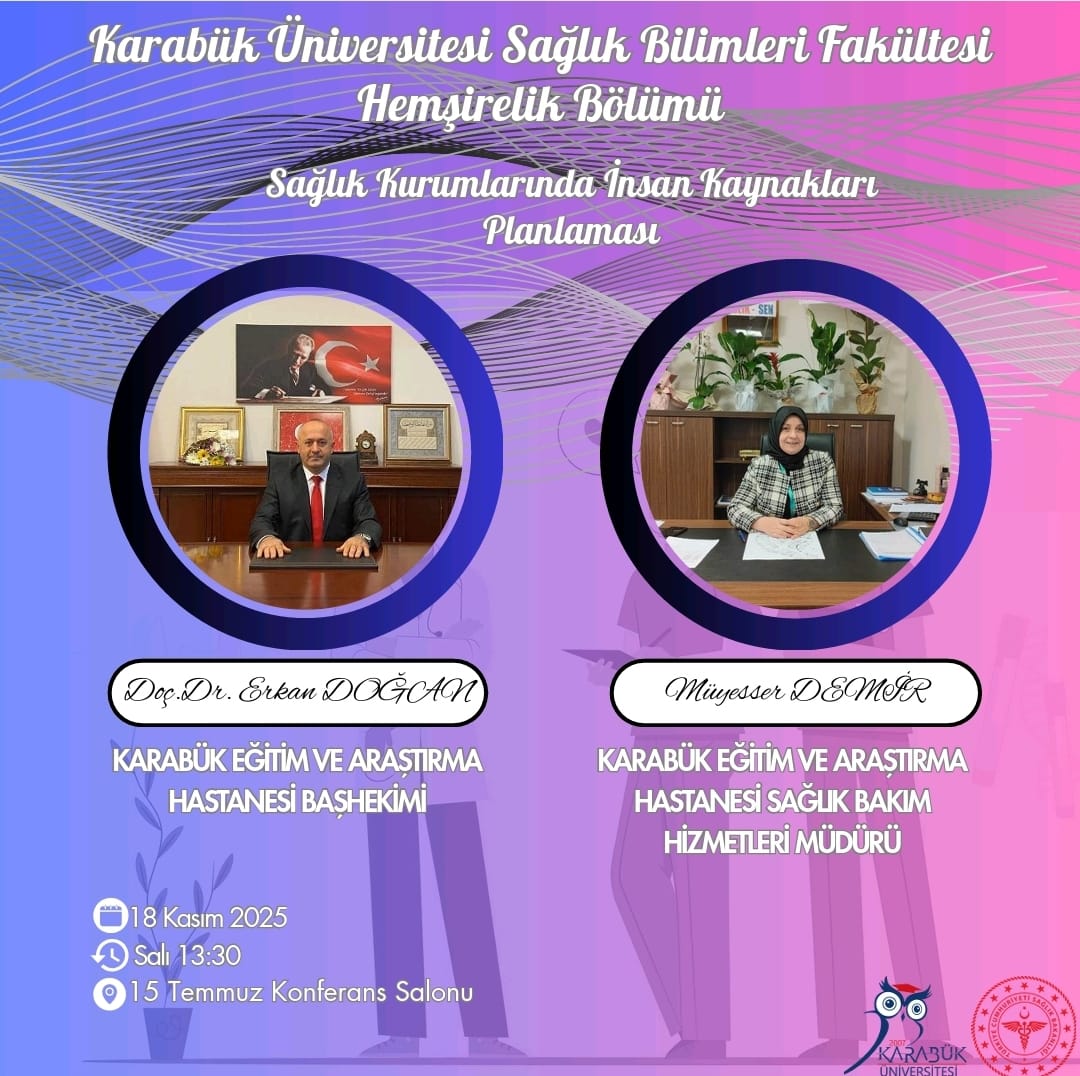 Fakültemiz Hemşirelik Bölümü HEM 329 Hemşirelikte Yönetim dersi kapsamında Karabük Eğitim ve Araştırma Hastanesi üst kademe yöneticileri ile "Sağlık Kurumlarında İnsan Kaynakları Planlaması" konulu kariyer söyleşisi düzenlenecektir.