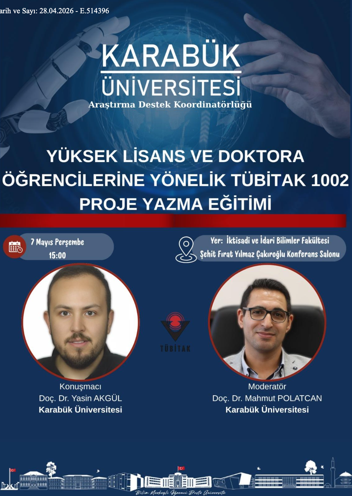 Üniversitemizde öğrenim görmekte olan yüksek lisans ve doktora öğrencilerimizin akademik gelişimlerine katkı sağlamak, proje hazırlama becerilerini geliştirmek ve TÜBİTAK destek programlarına başvuru süreçleri hakkında farkındalık oluşturmak amacıyla “TÜBİTAK 1002 Proje Yazma Eğitimi” düzenlenecektir.